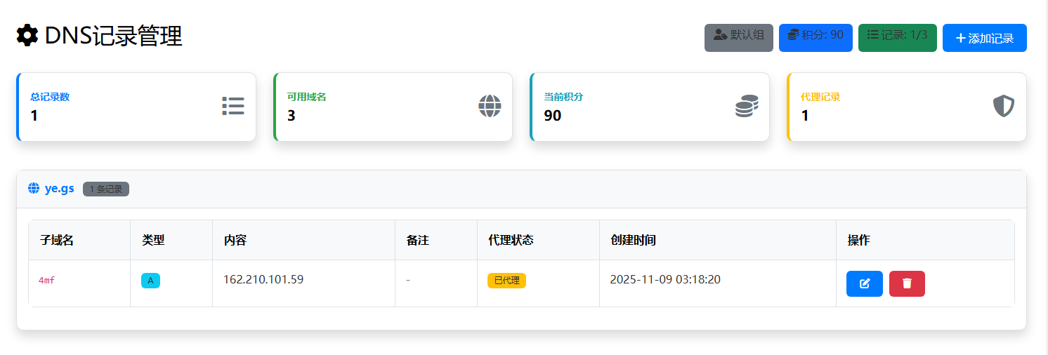 每添加一条DNS记录需要消耗 10 积分。积分不足时无法添加新记录,请联系管理员充值。