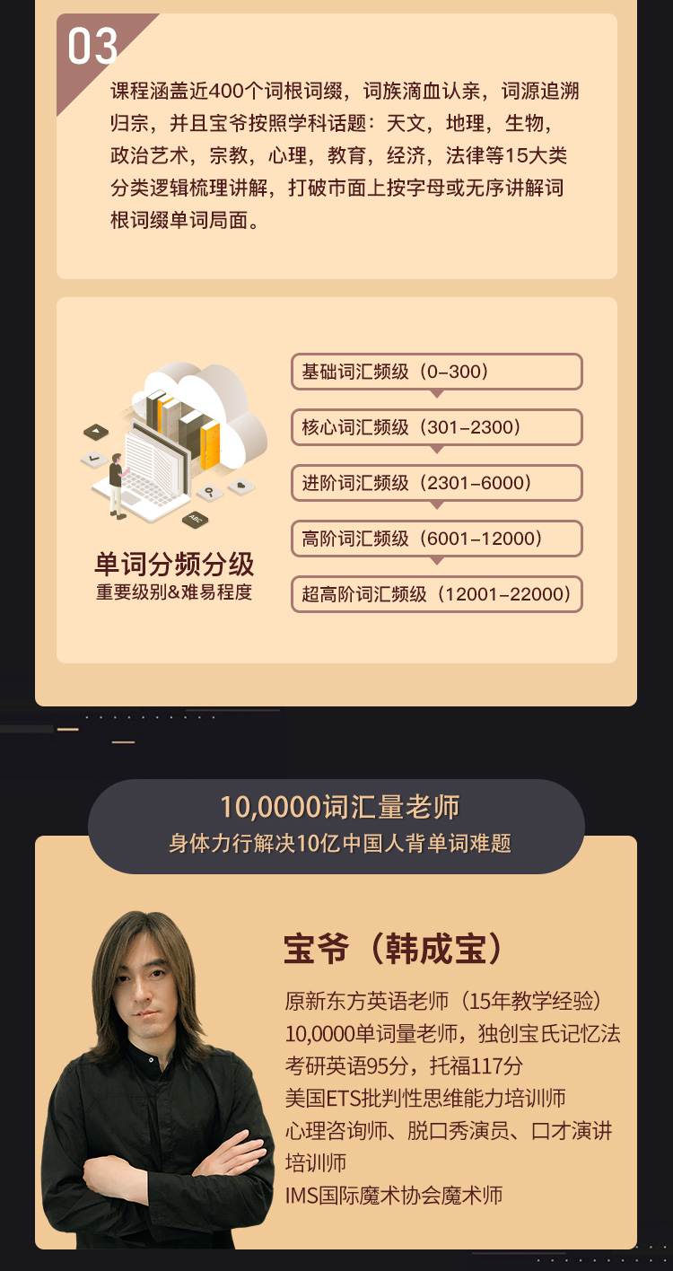 宝爷万词班挺不错的,宝爷作为国内首位站在TEDx讲台上的催眠讲师,宝爷专攻大脑认知和社交心理,在10年间帮助了数万学员走出心理困惑。
